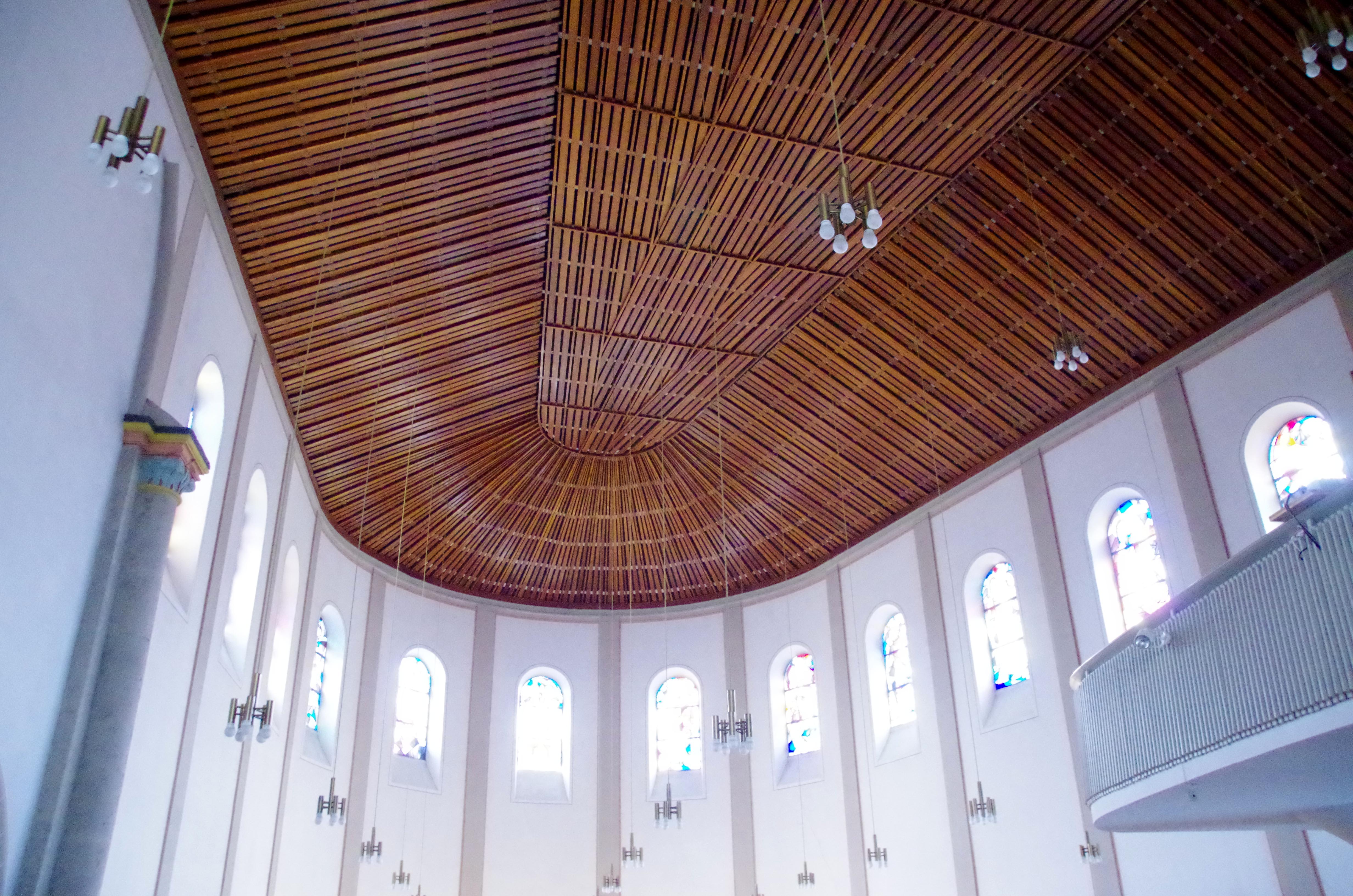 - das moderne Kirchenschiff spiegelt den Wiederaufbau nach der Katastrophe des Krieges,